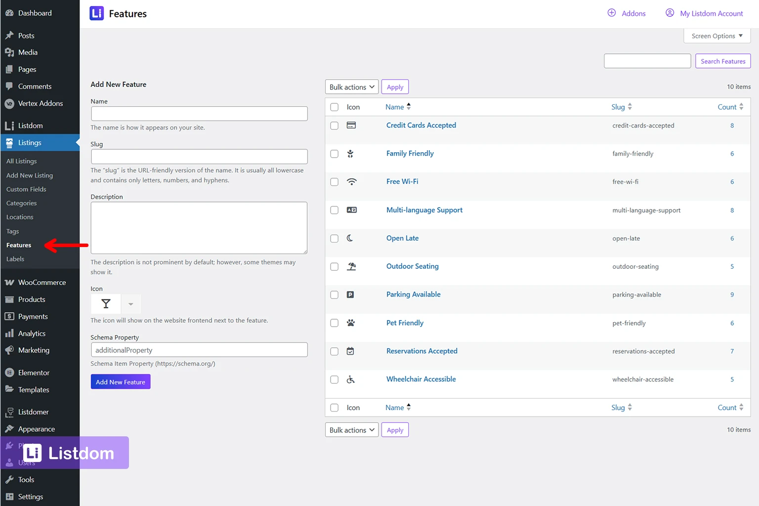 Listings → Features