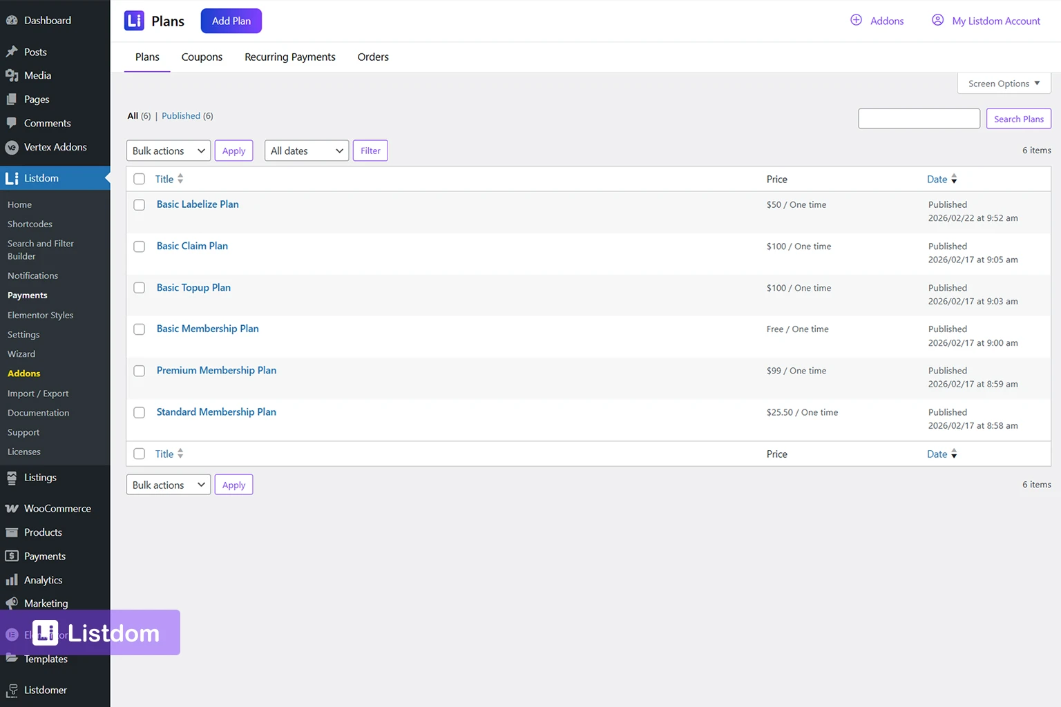 When native payments are enabled, Listdom adds a dedicated Payments area in the admin menu where you manage plans, coupons, orders, and recurring payments. Native recurring payments are part of the Pro-level payment path, so users planning subscription-style billing should account for that in the product choice. If you later decide WooCommerce is the better fit, you can switch between WooCommerce and the native engine from the Payments settings.