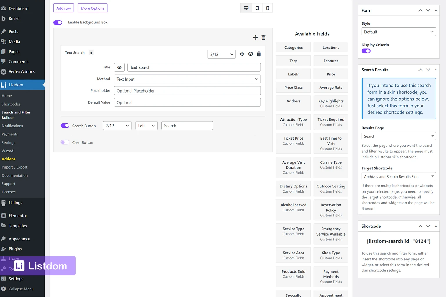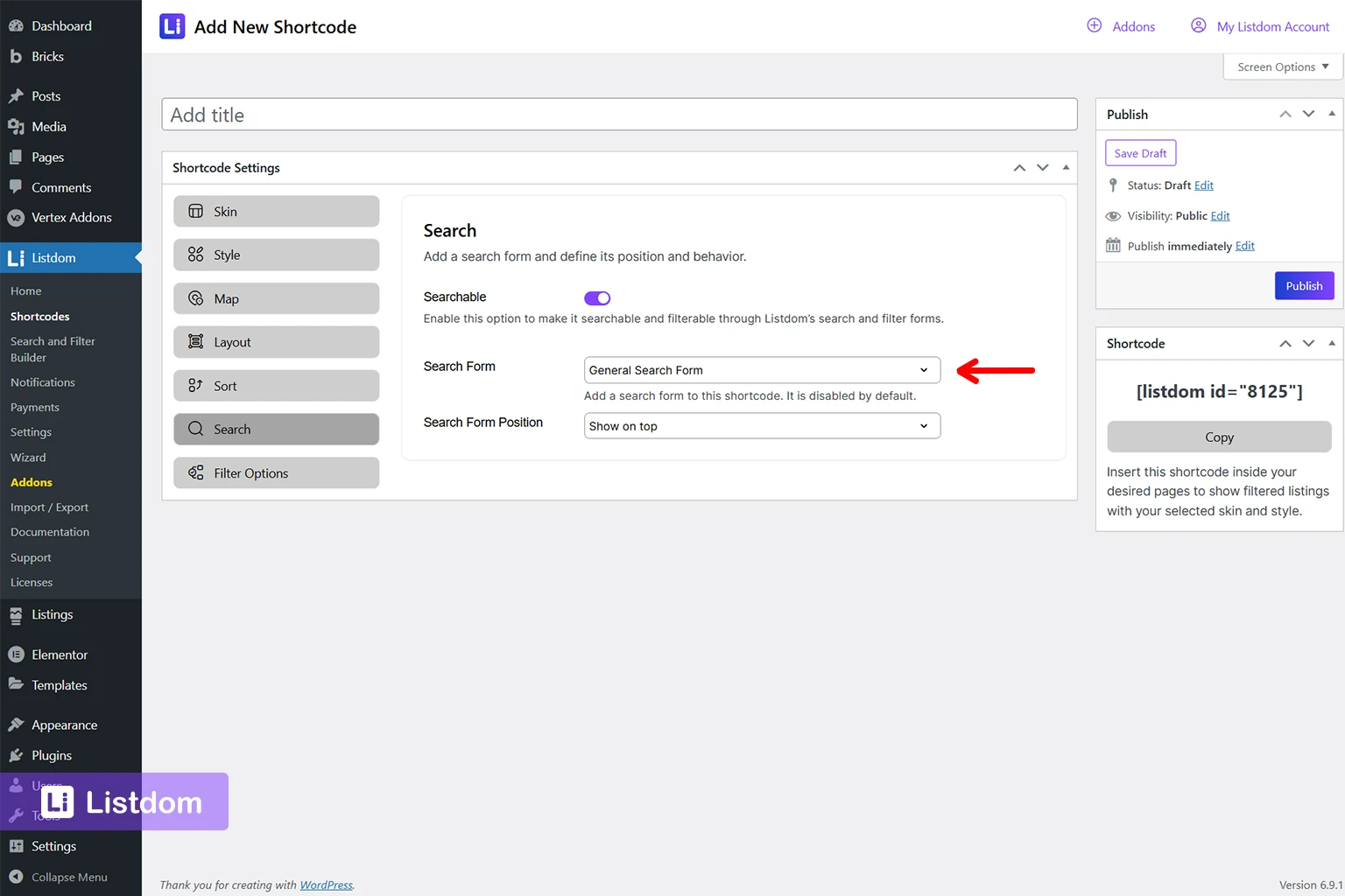 listdom shortcodes settings search tab interface