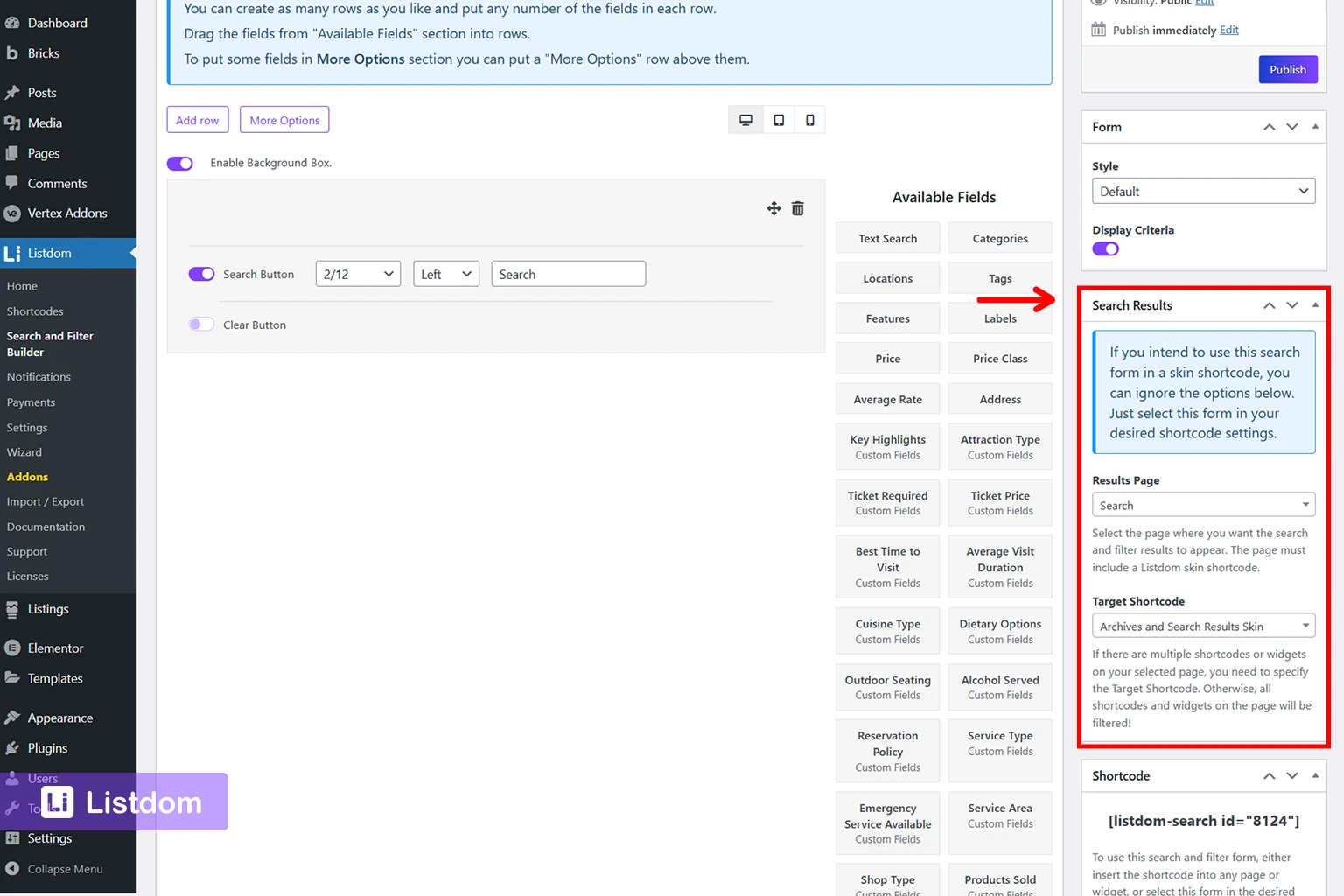 If you select a results page, the form redirects users there after submission. That page must already contain a Listdom listing shortcode or widget that can display the results.