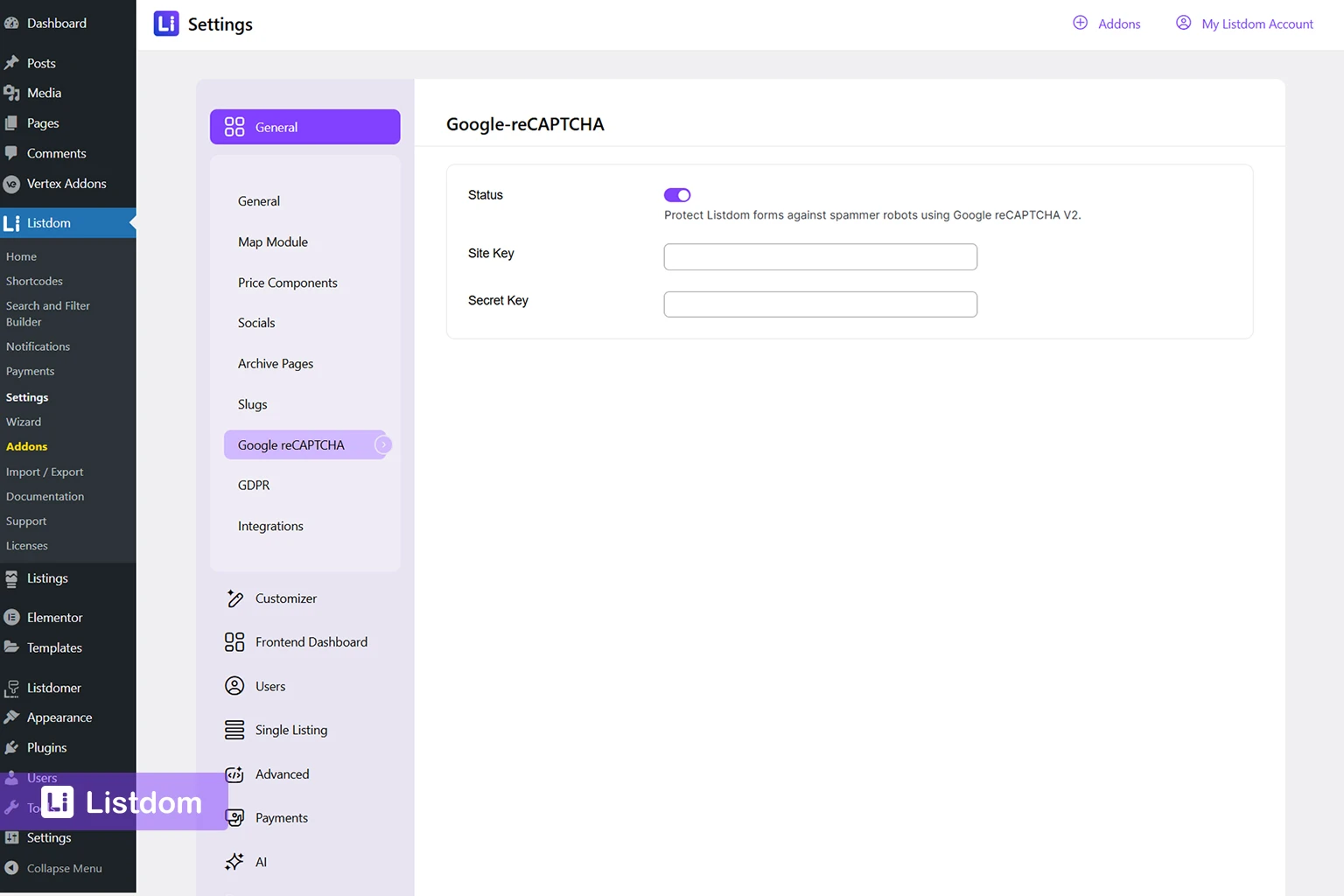 Inside Listdom → Settings, you may still see multiple internal sections such as General, Frontend Dashboard, Single Listing, Advanced, API, Addons, and Toolkits. That is still part of the main settings structure, not a completely separate settings world.